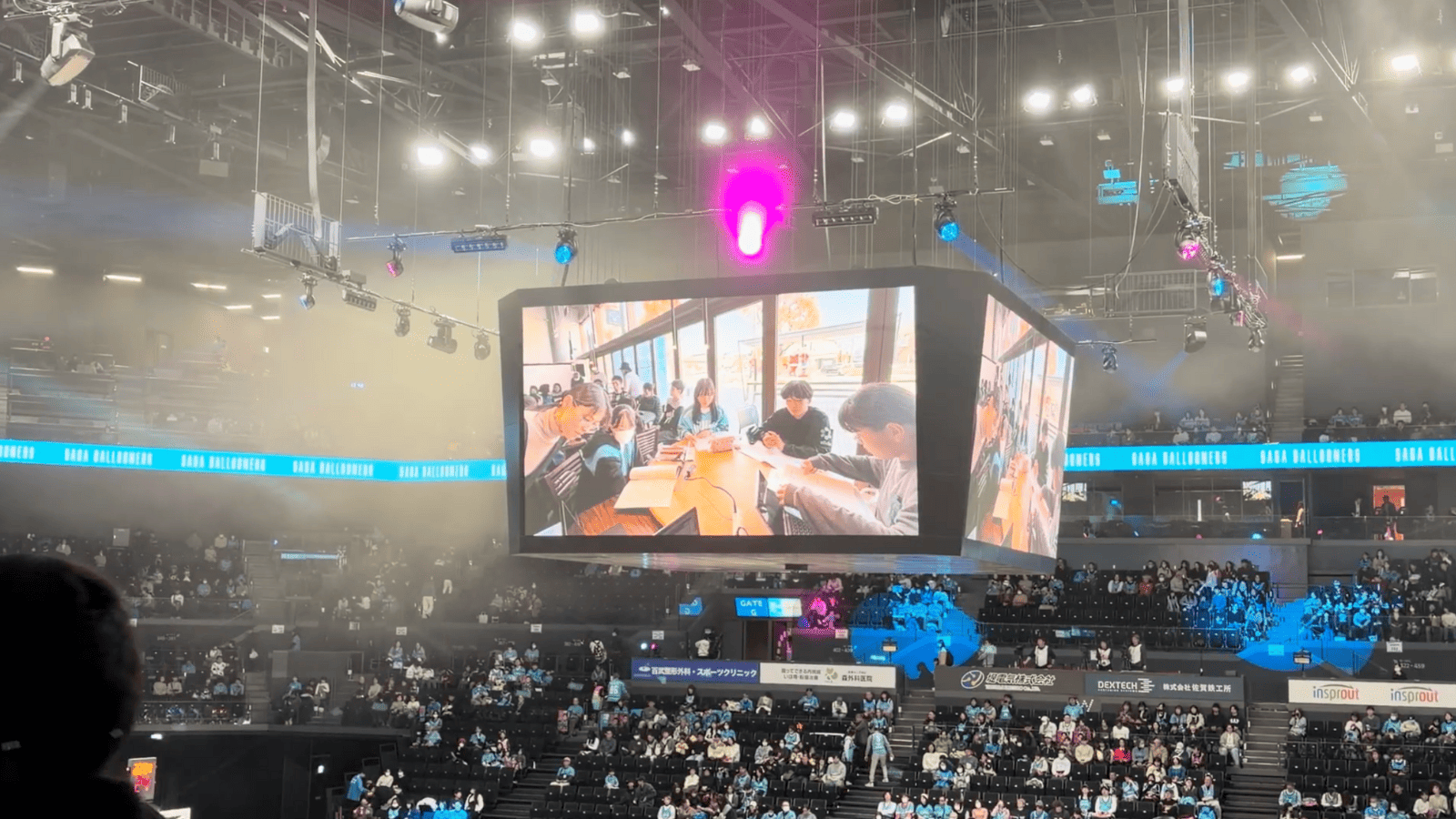 DAY1のワークショップを経て、参加者たちが磨き上げた作品がアリーナの随所で公開されました。デザインチームが作成したバナーは今回の試合告知に使用され、アリーナ中央の巨大ビジョンには、DAY1の活動の様子や、中学生たちが生成AIで制作したダイナミックなプロモーション動画が映し出されます。プロの試合演出の一部として自分の作品が流れる様子に、参加者たちは大いに盛り上がりました。