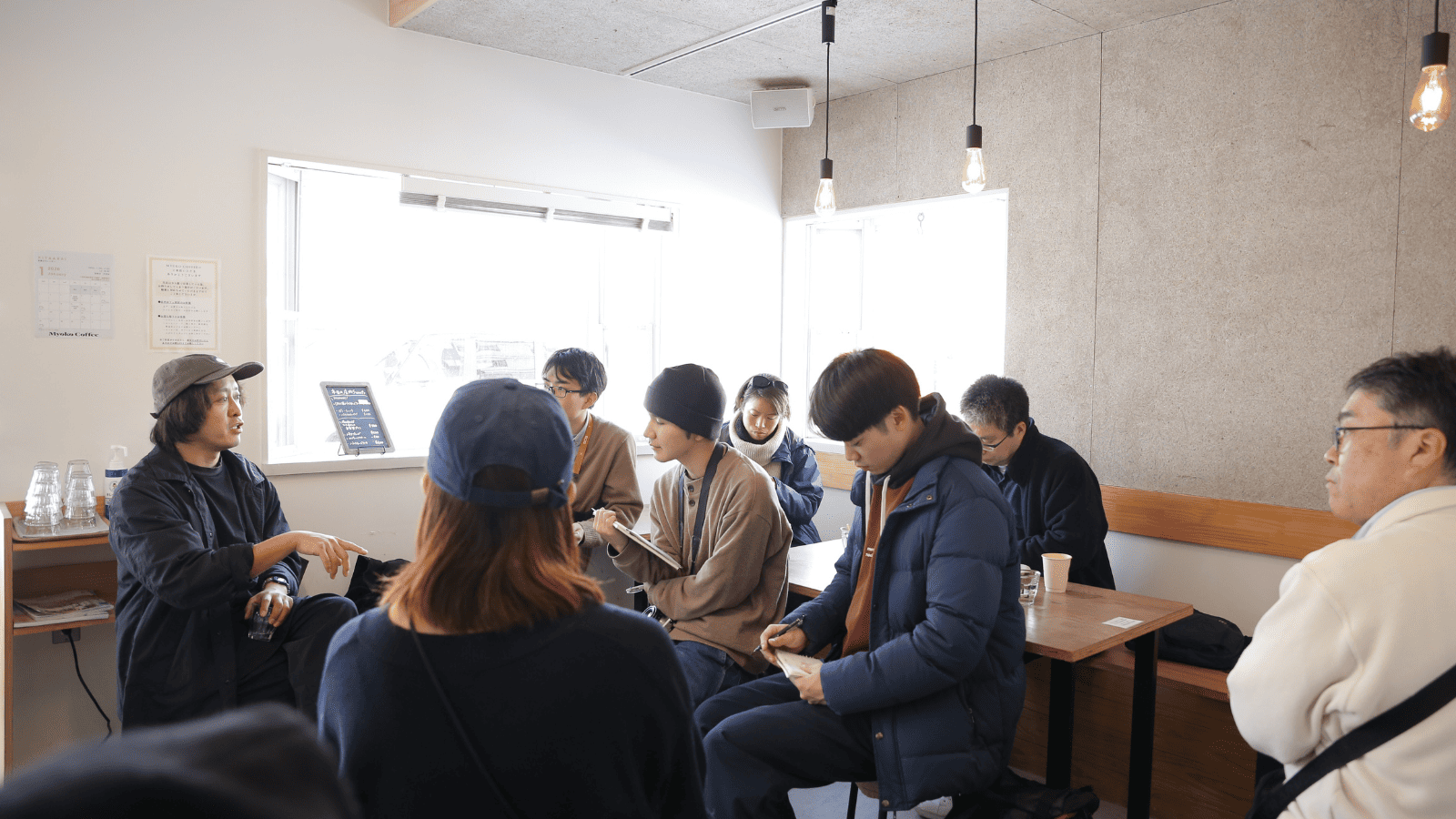 新井エリアに新設された図書館施設「まちなかプラス」でオリエンテーションを実施し、最初の訪問先である「Myoko Coffee 北新井店」へ。